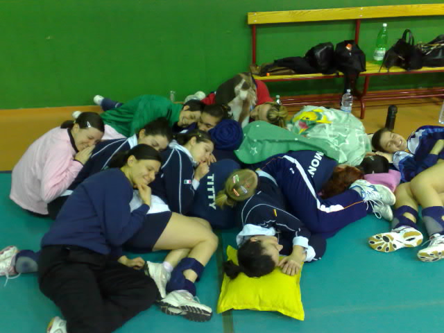 Le belle di sera si accampano in palestra. Saranno belle anche di notte? L`importante č che siano belle di sabato